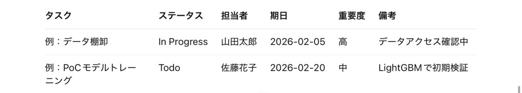 - Modeler: サンプル CSV(小規模)で学習→analysis_json が返るか、plots が managed folder に保存されるか